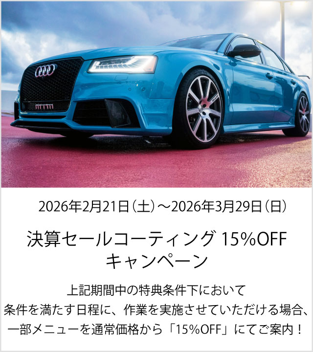 期間中の特典条件下において、対象のコーティング作業を実施させていただける場合 全てのベーシックプラン・スタンダードプラン・プレミアムプランご用命で、 当店通常価格から「15%OFF」にてご案内いたします。