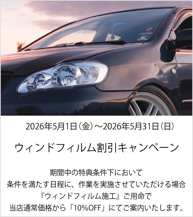 期間中の特典条件下において、条件を満たす日程に、作業を実施させていただける場合、 ウィンドフィルム施工をご用命で当店通常価格から「10%OFF」にてご案内いたします。
