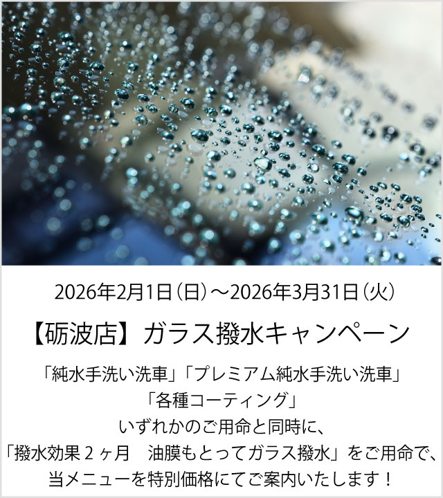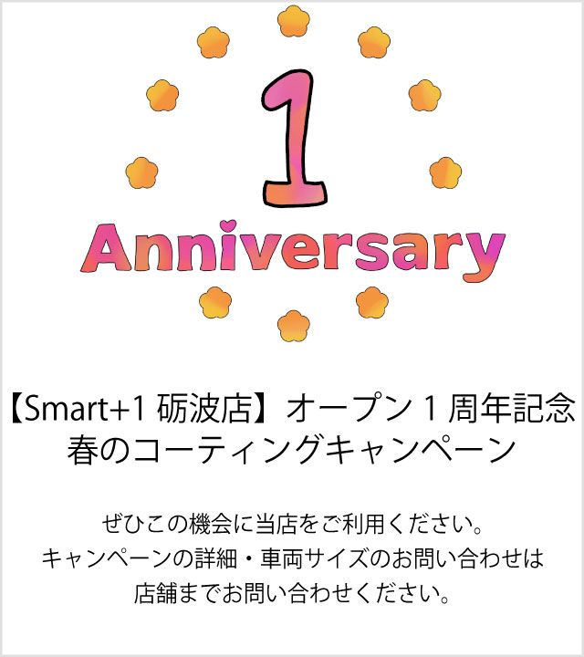 オープン1周年を記念いたしまして、春のコーティングキャンペーンを実施いたします。 詳細・車両サイズのお問い合わせは店舗までお問い合わせください。