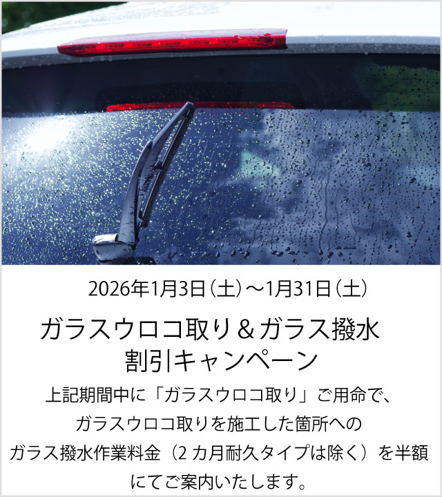期間中、当店取り扱いの各種コーティングをご用命いただきますと、 3,600円相当のフロントガラス撥水(油膜除去含む)を、 サービスで施工させていただきます。