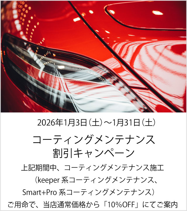 期間中の特典条件下において、コーティングメンテナンス施工(keeper系コーティングメンテナンス、Smart+Pro系コーティングメンテナンス)ご用命で 当店通常価格から「10%OFF」にてご案内いたします。
